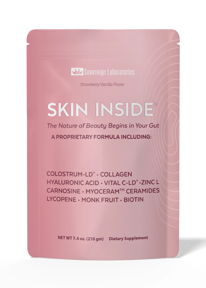 Skin Inside targets your gut first with Colostrum-LD®. There are over 165 studies that you can find on PubMed.gov that show all the different health benefits of bovine colostrum for gut health, immune health, aiding in athletic recovery, helping build lean muscle mass in conjunction with resistance band training, and promoting hair, skin, and nail health.